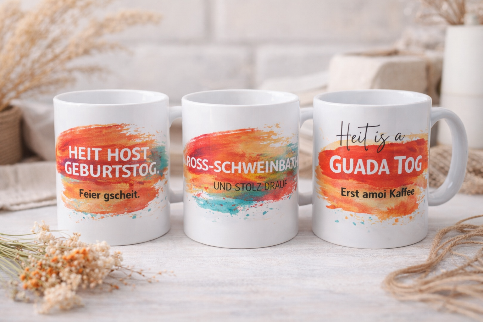 Ob „Heit is a guada Tog“, „Heit host Geburtstag“ oder „Groß-Schweinbarth und stolz drauf“ – diese Tassen bringen Dialekt, Humor und Heimatgefühl direkt auf den Frühstückstisch.
